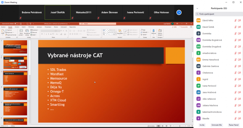 Obsah prednášky: Prednáška mala teoreticko-praktický charakter ponúkajúci pohľad na prácu s nástrojmi pre počítačom podporovaný preklad-CAT. Ako príklad boli uvedené dva prekladateľské nástroje - SDL Trados a MemoQ.